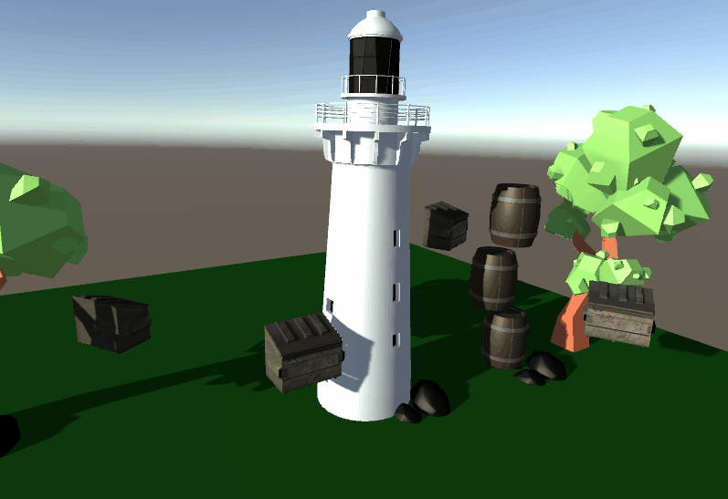A scene was created in Unity using a barrel and lighthouse created in blender earlier, then exported from Blender as FBX files and added to the Unity asset folder, along with their textures as pngs, joined by a number of items downloaded from Turbosquid: