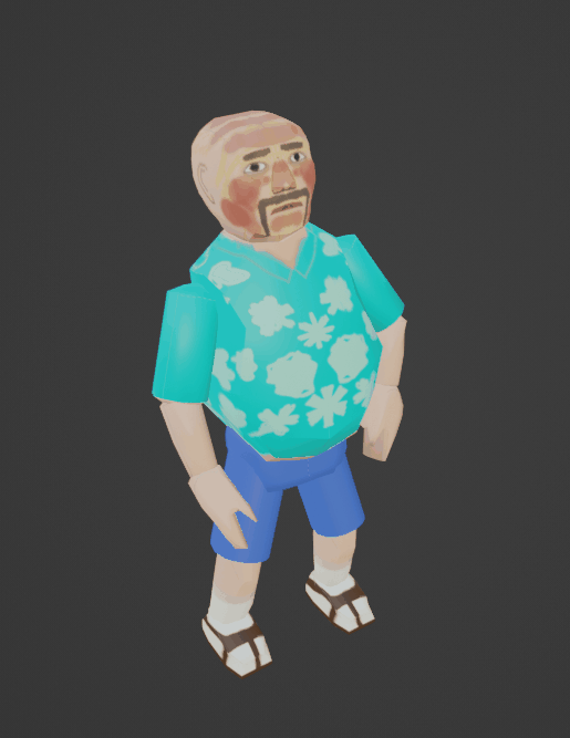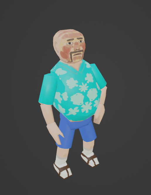 This tourist was then rigged using armatures and weighted using the weight painting tool, which allowed him to be posed and animated easily.