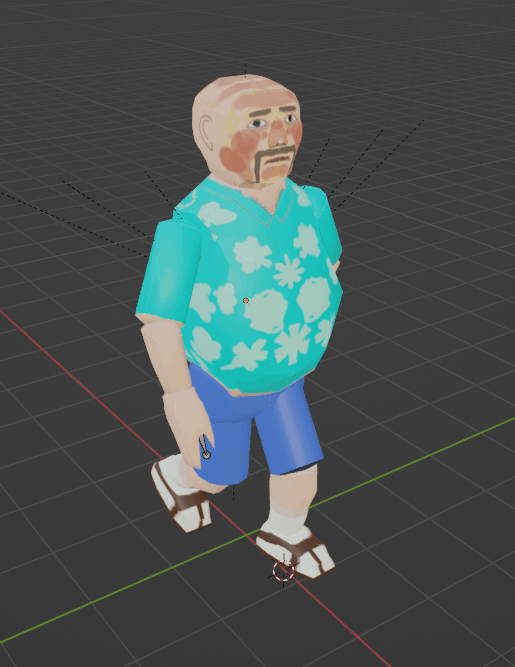 Once the tourist was rigged with armatures he was animated by inserting keyframes while posed into key poses, with Blender tweening the frames between key frames to create a smooth transition.